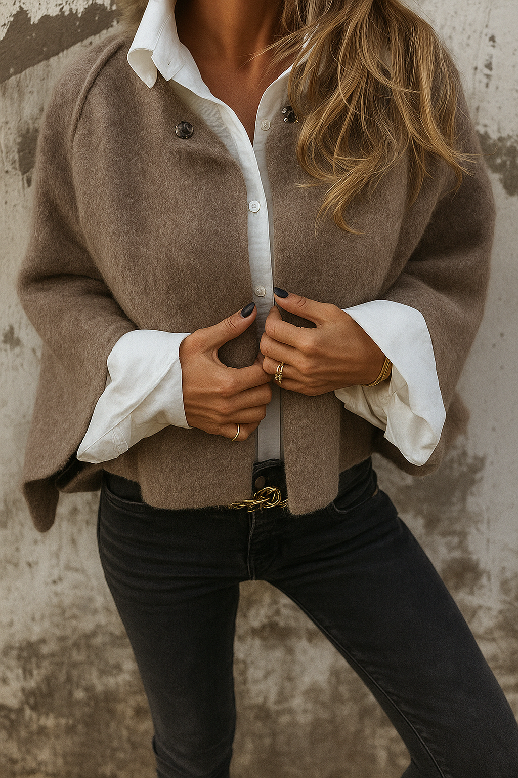 Tato krátká bunda s elegantně rozšířenými rukávy kombinuje nadčasovou eleganci s moderním designem.